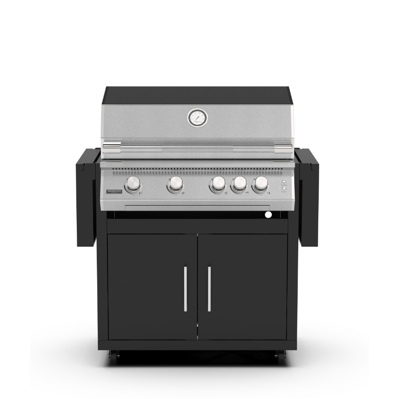 The Cart Grill 400 M is a cart designed for Brabura grills, providing a stable and functional base for more comfortable cooking. It features an internal gas bottle holder and foldable side trays, offering greater organization and workspace in the outdoor kitchen.